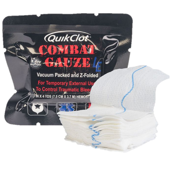 • QuikClot LE Combat Gauze — Hemostatic agent promotes clotting without generating heat
