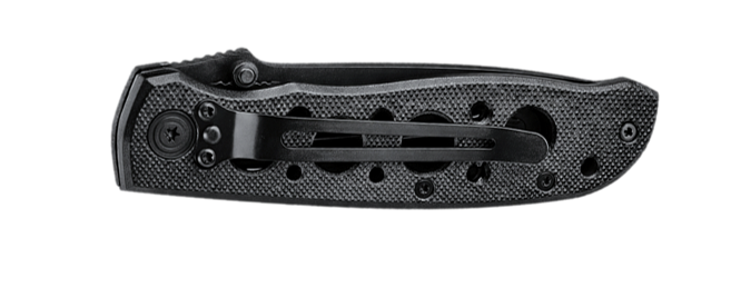 • 440C Stainless with Black Titanium Coating — Corrosion-resistant blade steel with a protective coating that reduces glare and resists scratching through hard daily use.