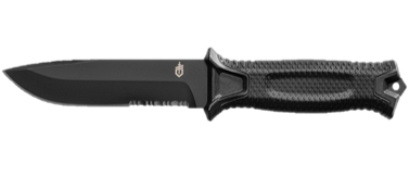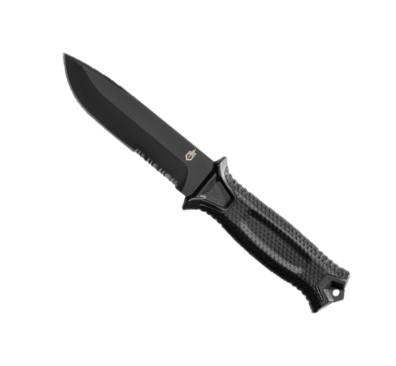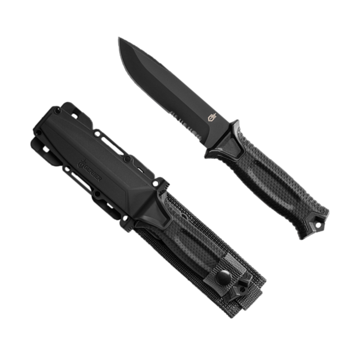 Gerber StrongArm β Black Serrated Full tang 420HC steel, ceramic coated, with a rubberized diamond-texture grip that stays locked in your hand when it's wet, muddy, or bloody. The partially serrated edge gives you both fine cutting and aggressive material tearing in one blade. But the real differentiator is the sheath β Gerber's modular snap-together system lets you mount vertically on MOLLE, horizontally on a 1.75" tactical belt, or in a traditional drop-leg configuration. No other fixed blade at this price gives you that much carry flexibility. Made in Portland, Oregon U.S.A.